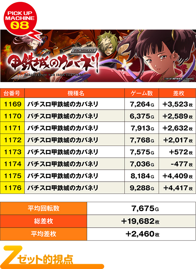 『パチスロ甲鉄城のカバネリ』は全26台設置だが、この8台は列で好結果を収めていた。1列まるまるが優秀台ムーブをしていたため、気づいた方もいたのではないだろうか。