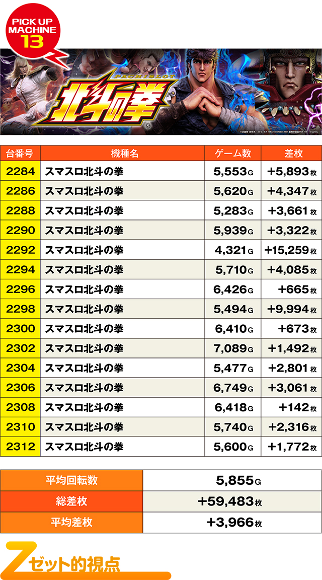 相変わらずの人気を誇る『スマスロ北斗の拳』でも好結果が頻出。ご覧の通りの台数が好結果を収めており、ニブイチで優秀台があったのでは?と思わせるほど。10,000枚に6枚足りなかった2298番台と、15,000枚突破を果たした2292番台はお見事!