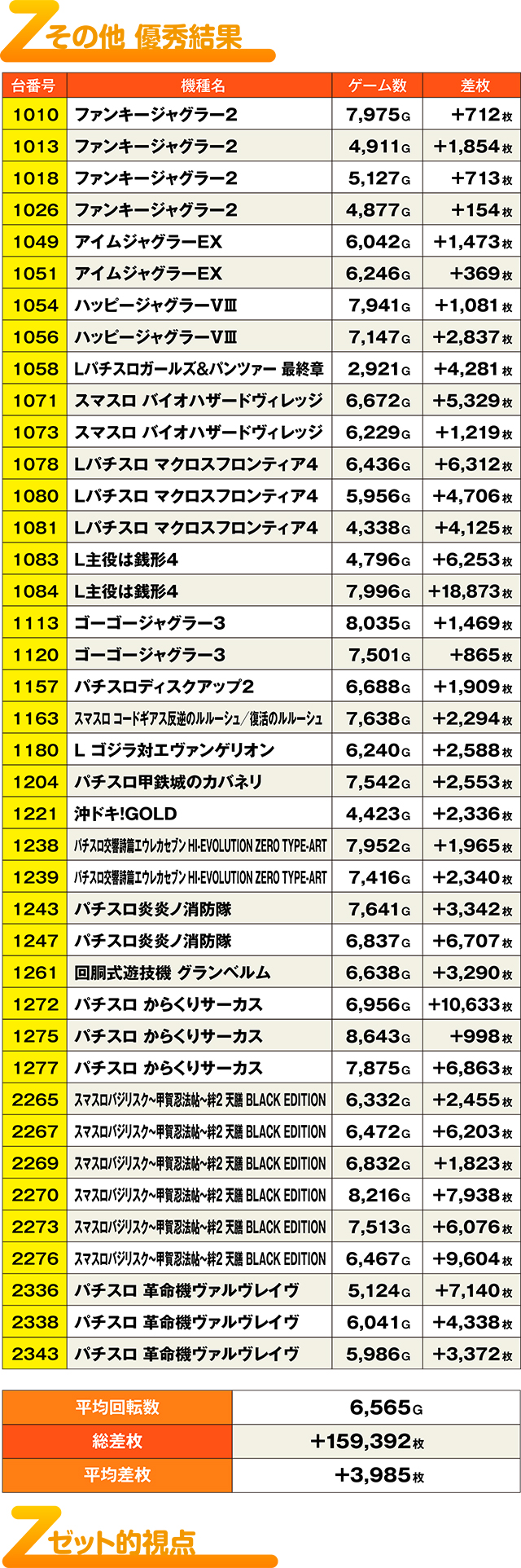 当然今回も並びの仕掛け以外からも優秀台を思わせる結果が続々と生まれていた。なんと3,000枚オーバー記録が19台、5,000枚オーバーが12台、そして10,000枚オーバーが2台と、これまでにない凄まじい結果となった。特に18,873枚というモンスターレコードを叩き出した『L主役は銭形4』には、次回以降も注目すべきだろう。