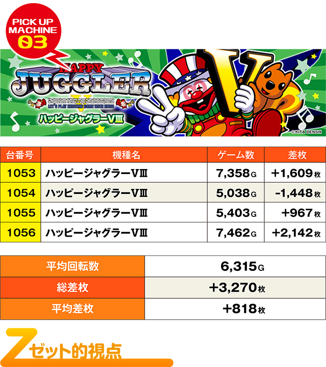 4台並びっぽい挙動を見せていた『ハッピージャグラーⅤⅢ』は、平均が818枚とあとひと押しほしかった印象。でもトータルプラスなので問題なし。