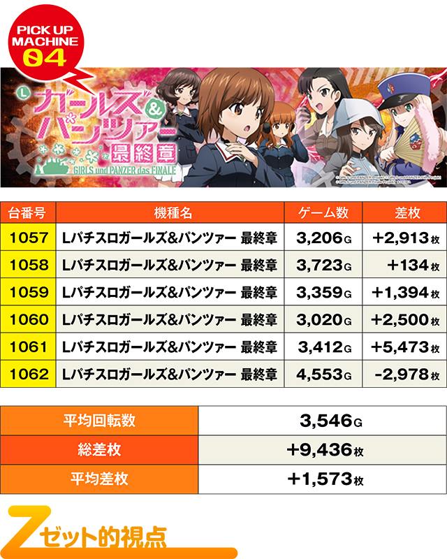 6台設置の『Lパチスロガールズ&パンツァー 最終章』にマイナス台は1台のみ。その他5台がプラっていることから全台系だった可能性が濃厚だ。