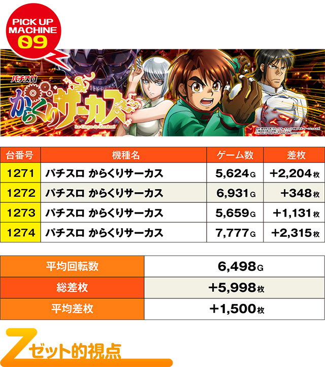 4台並びと思しき結果を残した『パチスロ からくりサーカス』。平均+1,500枚という数値もさることながら、各台の挙動は優秀台のそれだった。