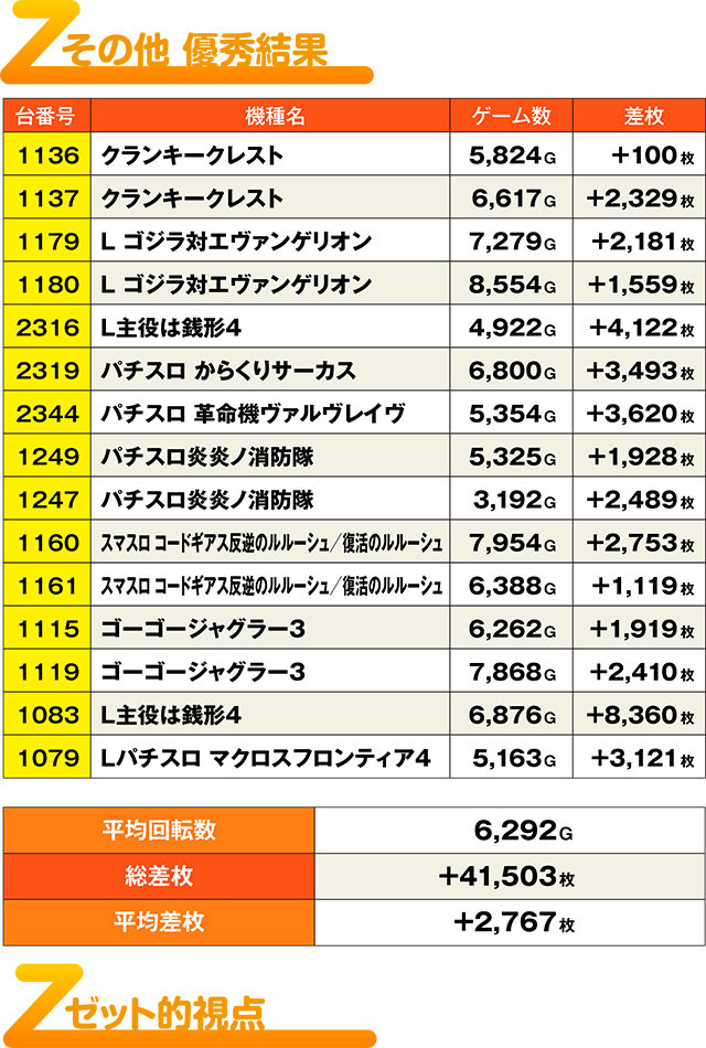 今回も2台づつ優秀結果を残している機種が多いことに気づいただろうか。これはつまり、最低でも5機種に2台づつ優秀台が存在していたということになる。マイナスで終わった優秀台やあまり稼働しなかった優秀台などもあったことだろう。実際はもっと多くの優秀台が眠っていたのは間違いなさそうだ。