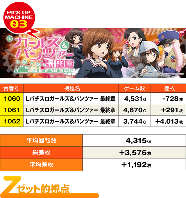 『Lパチスロガールズ&パンツァー 最終章』でも3台並びっぽい箇所があったが、2台がやや少ない総回転数だったためか、結果を残したのは1062番台だけだった。