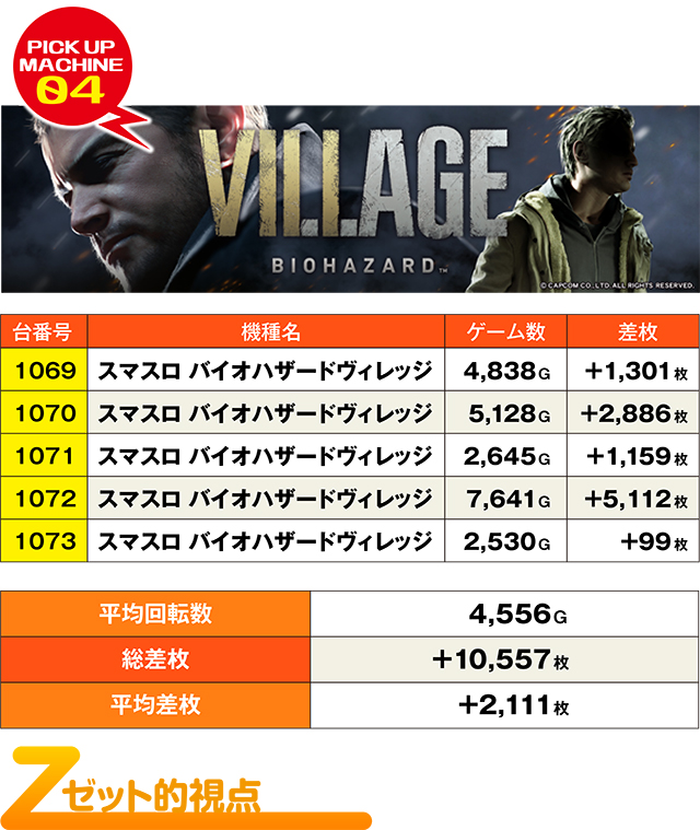 5台すべてがしっかりプラっていた『スマスロ バイオハザードヴィレッジ』。平均回転数4,500G程度で平均+2,000枚超えだったのは、全台系だったから…?