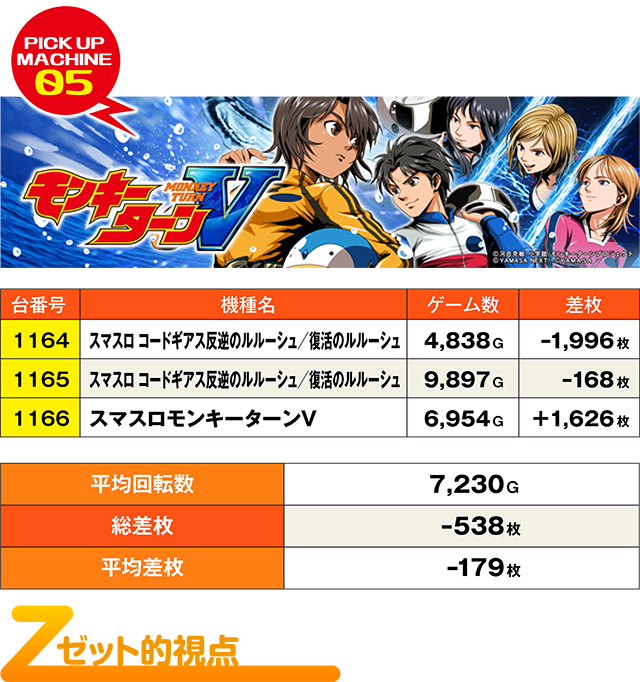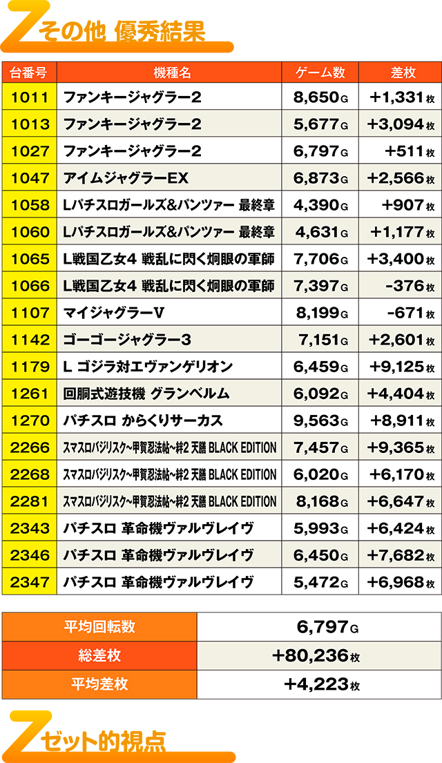 今回は並びよりも単品の方からド肝を抜く結果が多く生まれていた。なにしろ上表をご覧の通り、単品から5,000枚超え記録が8台も生まれていたのである。そして結果の数値から判断するに、人気マシンにそれぞれ2~3台ずつ優秀台が潜んでいた…!?