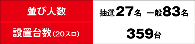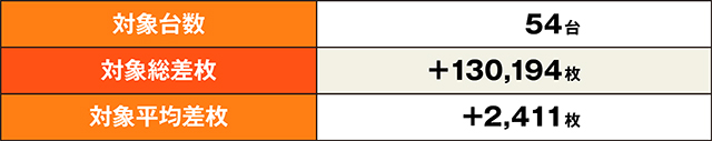 今回の対象総台数は54台。その平均は+2,411枚であり、不発台が少なかった印象だった。パチスロコーナーにはいつも通りに並び・全台系・単品の仕掛けが施されており、早々と優秀台を見つけ出し、ブン回し態勢に入っていた方の姿も確認している。今回は珍しく並びの仕掛けよりも単品の仕掛けの方が活躍していたのも興味深い。