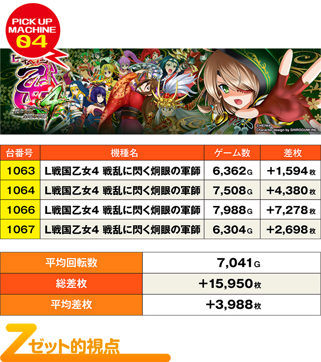 8台設置の『L戦国乙女4 戦乱に閃く炯眼の軍師』は、半数の4台が並びでプラス。そのプラス差枚の数値を見るに、優秀台の4台並びだったのかもしれない。