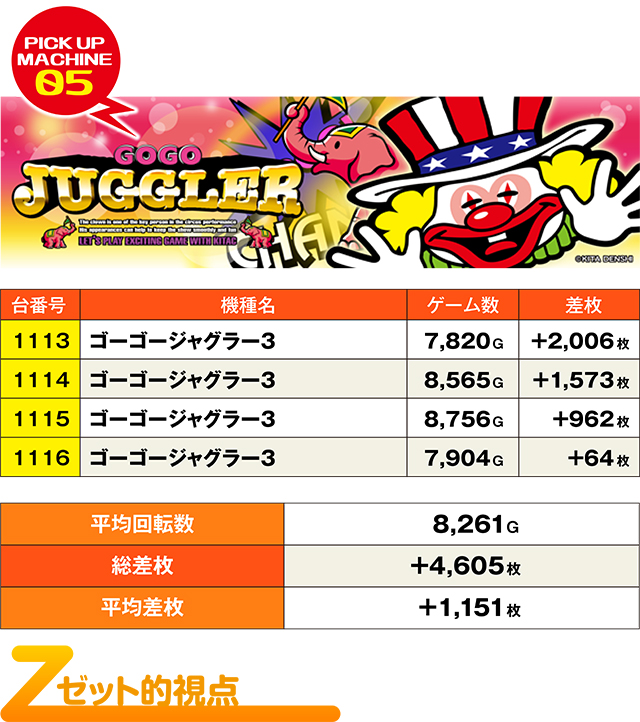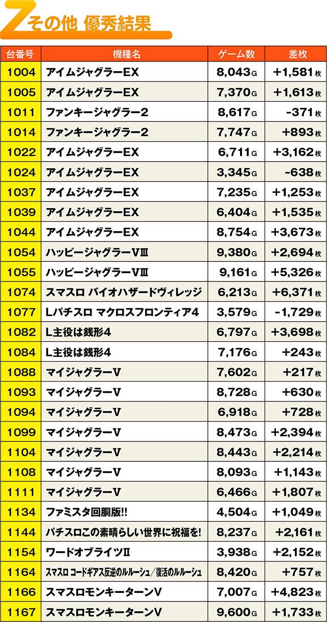 この日は、並びの仕掛けが少なかった分、単品でかなりの数の優秀台を目撃することとなった。ざっと数えただけで、3,000枚オーバーが12台。特に『ジャグラー』シリーズと、今回並びの仕掛けがなかった『スマスロ北斗の拳』に優秀台が数多く潜んでいたようだ。