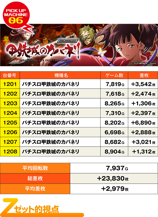 『パチスロ甲鉄城のカバネリ』の8台から成る列は、なんと8台ともがプラス差枚!さらにこの8台の平均差枚は+3,000枚に迫る好記録だった!