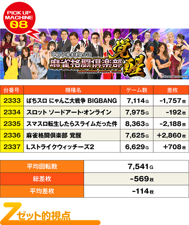 バラエティーコーナーに5台並びを匂わせるゾーンあり。だが残念、総ゲーム数の少ない台もあってか、マイナス台が上回る結果に…。