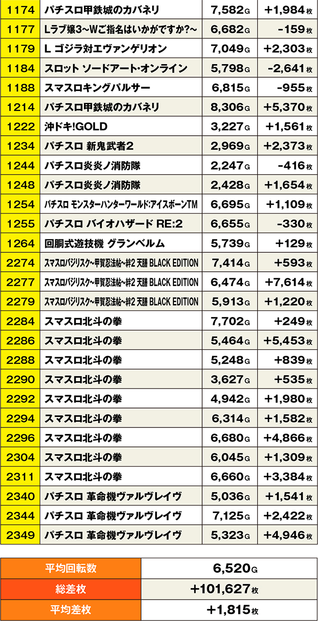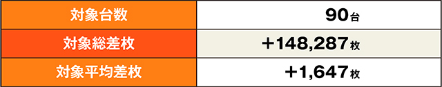 1058番台が本領を発揮し、7,000枚に迫る好結果を叩き出した。そのお隣の台も調子は悪くなかったようで、終わってみれば3,000枚弱の結果に。