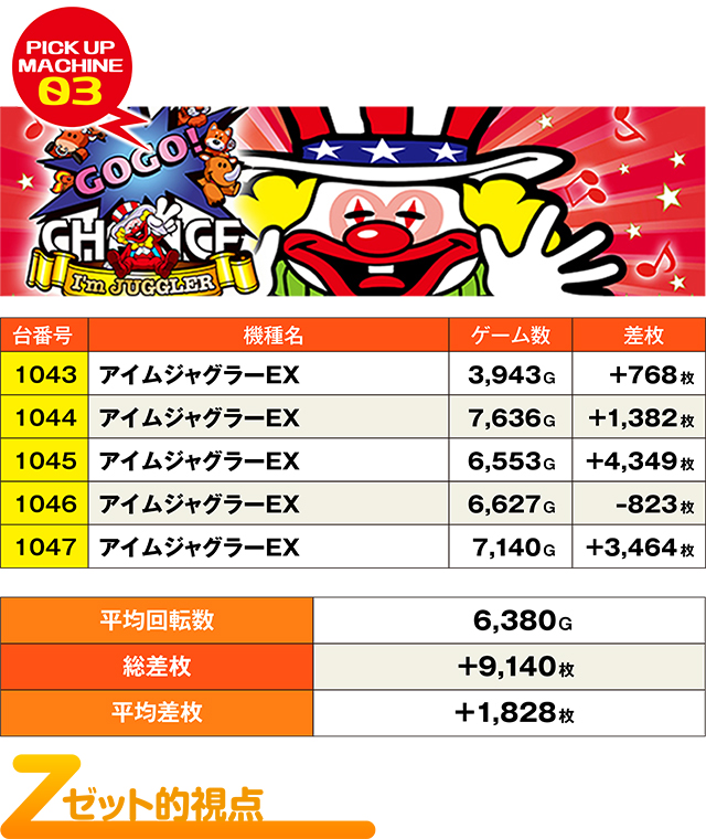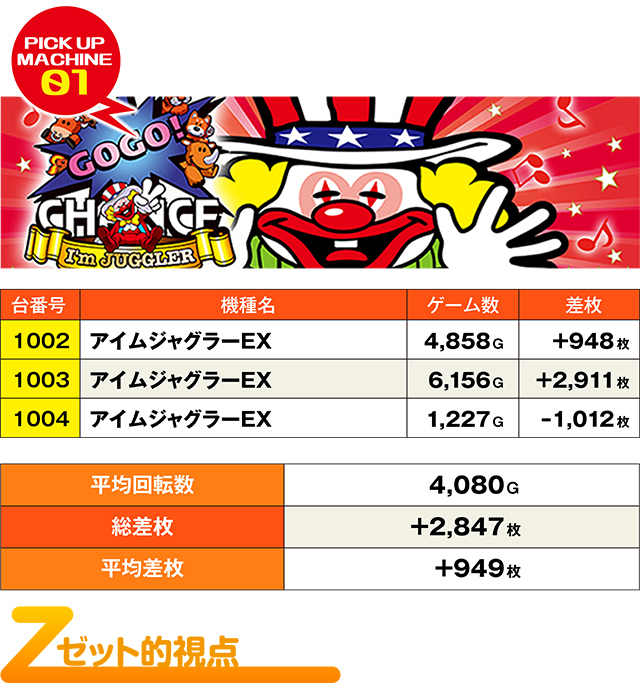 いつも通り、『アイムジャグラーEX』に優秀台並びと思われるゾーンあり。1,000Gちょいしか回されていない1004番台はマイナスだったが、残る2台はしっかり優秀台挙動!
