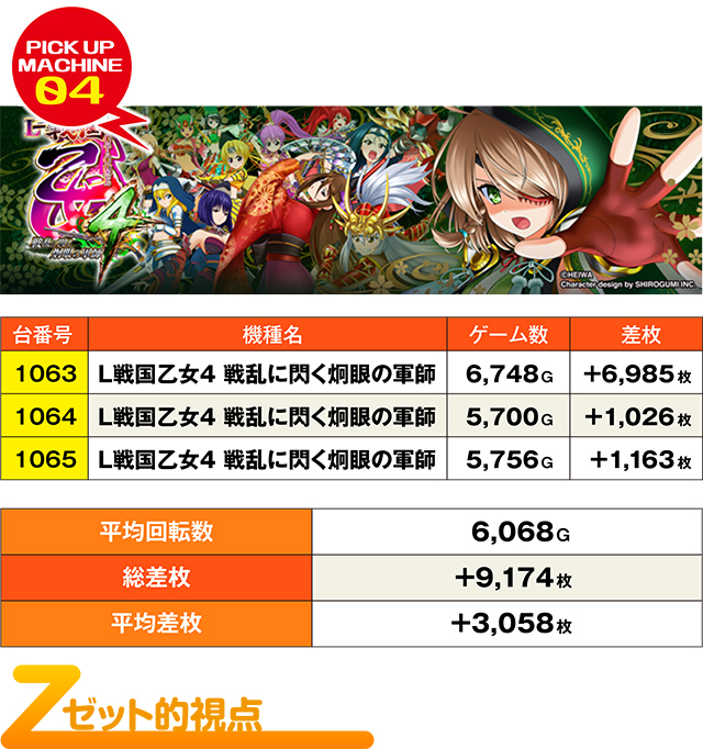6台設置の『L戦国乙女4 戦乱に閃く炯眼の軍師』は半数の3台が優秀台ムーブを披露。特に1063番台は7,000枚に迫る好結果を残しており、同機はニブイチだった可能性が濃厚!