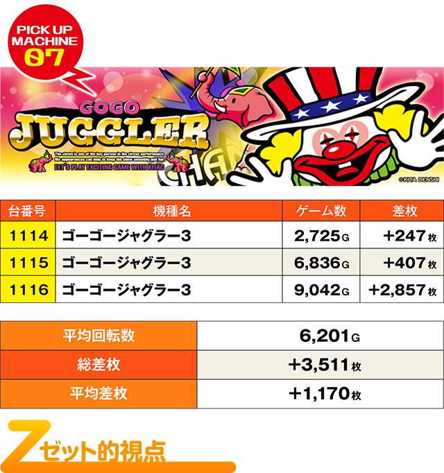 3台ともにコンスタントにGOGOランプをペカらせていた『ゴーゴージャグラー3』だが、特に強かったのは、2,800枚オーバー記録を叩き出した1116番台。