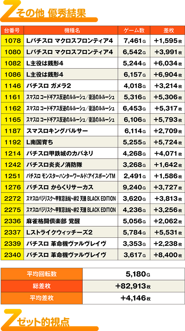 今回も単品でも多くの優秀台が存在していた様子。3,000枚オーバーがこれだけ溢れていたことから、遊びに来ていた常連さんたちも優秀台の息吹を感じていたことだろう。注目は、5,000枚超えを3台も生み出した『スマスロ コードギアス反逆のルルーシュ/復活のルルーシュ』!