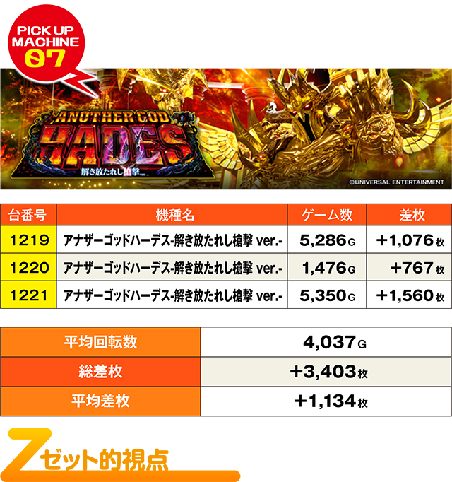 3台設置の『アナザーゴッドハーデス-解き放たれし槍撃 ver.-』はやや控えめな結果に。真ん中の台は総ゲーム数が少ないのでともかく、両脇の台は覚醒せぬまま閉店を迎えてしまった…。