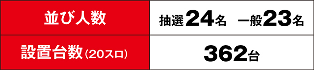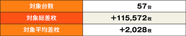 今回の対象台数は計57台。その平均は+2,028枚と、もはや対象機種の平均が+2,000枚を上回るのが当たり前に。そして今回も並び・全台系・単品と、おなじみの仕掛けがパチスロコーナーを彩り、常連スロッターたちを満足させていたのは間違いない。