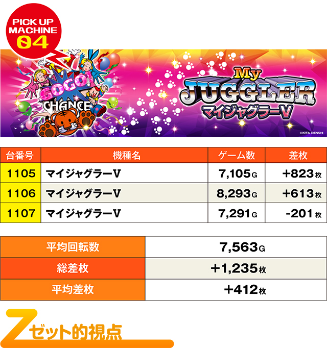 『マイジャグラーⅤ』に2つめの3台並びっぽいゾーン!特に真ん中の1102番台は、5,000枚に迫る好レコードを叩き出し、優秀台のポテンシャルを発揮!