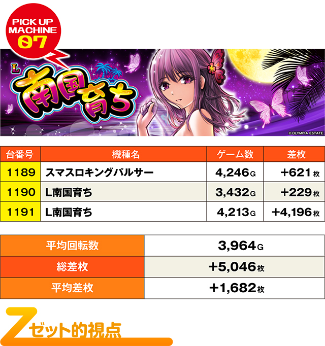 今回の対象台数は計51台。そしてまたしても平均+2,000枚超えを達成してくれた。語るまでもなく、今回も3台並び・ニブイチ・全台系・単品といった仕掛けを散見することができ、5,000枚超え記録も多く生まれていた。桜の開花とともに、優秀台も活発化してきたぞ!