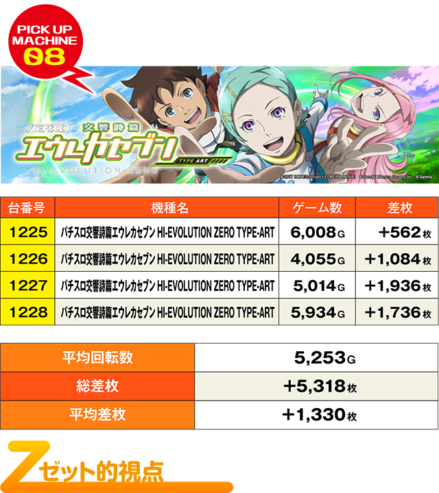 4台ともがしっかりプラっていた『パチスロ交響詩篇エウレカセブン HI-EVOLUTION ZERO TYPE-ART』。大きな記録こそなかったが、全台系の可能性アリアリ!