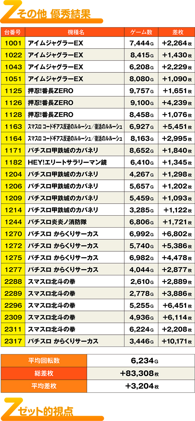 上表をじっくり眺めると、人気マシンには複数の優秀台が単品で配置されていたのが分かる。中でも『パチスロ甲鉄城のカバネリ』『パチスロ からくりサーカス』『スマスロ北斗の拳』には多かったようで、それが功を奏したのか、『からくり』&『北斗』からは5,000枚オーバー台が続出!バラエティーコーナーの『からくり』からは10,000枚超え記録まで!