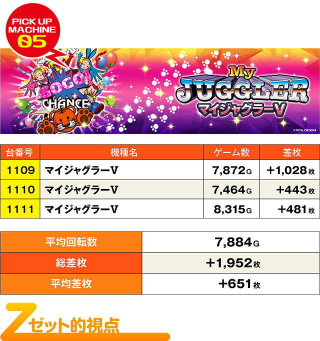 負けじと『マイジャグラーⅤ』からも3台並んでプラスのゾーン!差枚自体はおとなしめな数値だが、この総ゲーム数を回されてのプラスということは、3台並びの可能性が高い。