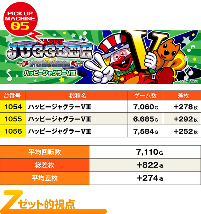 またしても『マイジャグラーⅤ』にて優秀台の3台並びと思しき結果。平均8,000G&平均+1,457枚という数値からも、3台並びと見てよさそうだ。