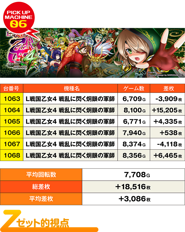 全6台設置の『L戦国乙女4 戦乱に閃く炯眼の軍師』は、4台がプラスだったことに加え、4,000枚超えが1台、6,000枚超えが1台、15,000枚超え(!)が1台と、全台系が濃厚!