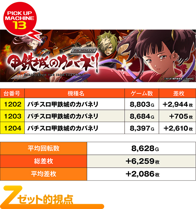 両脇の2台が+2,500枚超えを達成。真ん中の台もプラス差枚。毎回優秀台並びが出現する『パチスロ甲鉄城のカバネリ』なので、これはもう間違いないかと。