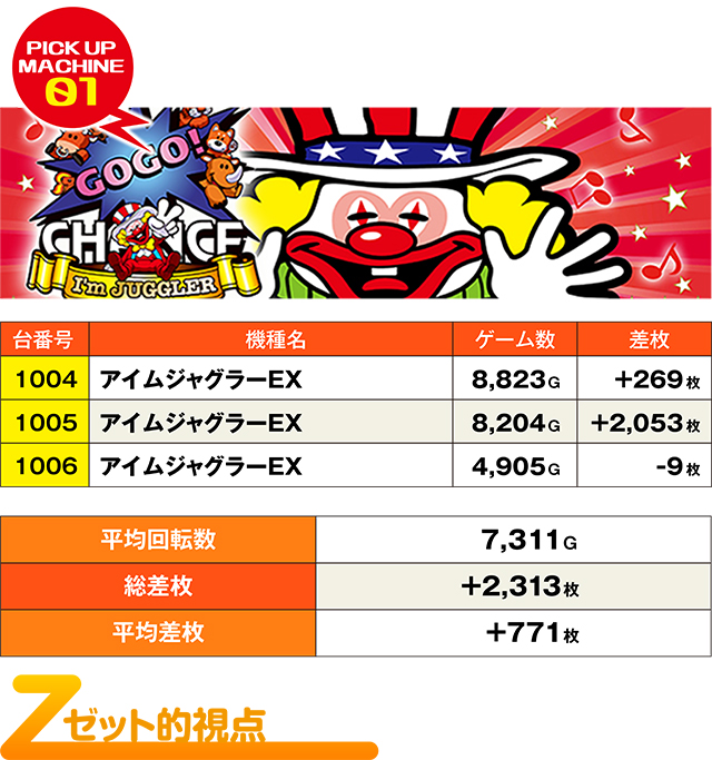 『マイジャグラーⅤ』に3台並んでのプラス!いずれも+1,500枚超えを果たしており、周年日に相応しい結果となったようだ。