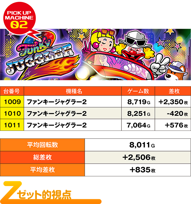 こちらの『ファンキージャグラー2』の3台も、優秀台並びのニオイがプンプン…。それだけに1010・1011番台が伸び切らなかったのが残念だ。