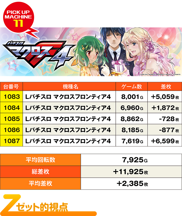 全台系を疑うに十分な結果となった『Lパチスロ マクロスフロンティア4』。各台の挙動が優秀台っぽかったとの現場の声から推察するに、マイナスの2台はヒキが悪かっただけだったのではないだろうか。