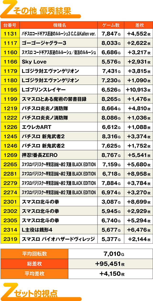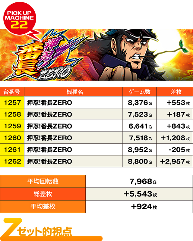 6台並んだうちの5台がプラっていた『押忍!番長ZERO』。残念ながら3,000枚オーバーがなく、決定打には欠けるものの、優秀台の6台並びの可能性は十分だと思う。