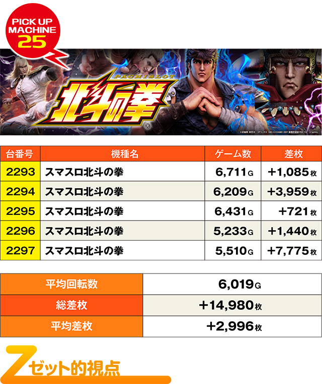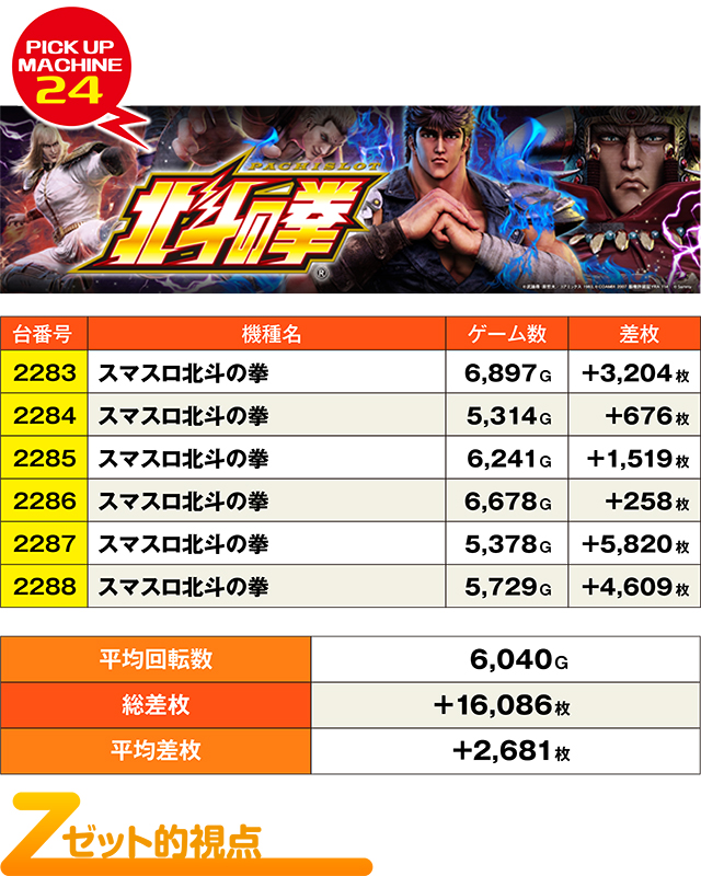 『スマスロ北斗の拳』コーナーでは6台並んでプラス。ここまできたらもう優秀台の6台並びと断定しちゃってもいい気がする。だって6台の平均が+2,681枚だもの…!