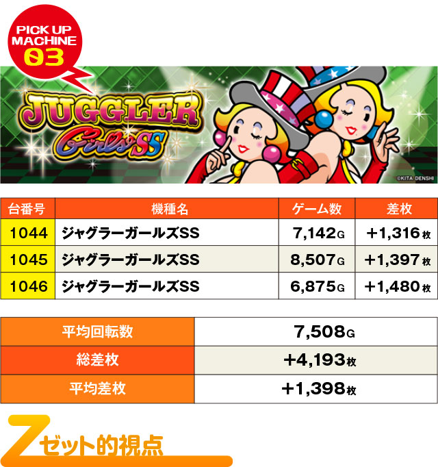 まだまだ新台色の強い『ジャグラーガールズSS』からも優秀台の3台並びと思しき結果が出現。3台とも+2,000枚を上回ることはなかったが、安定感はバツグン!