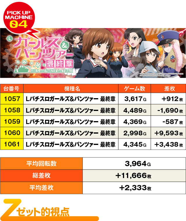 1060番台が9,500枚オーバーを達成した『Lパチスロガールズ&パンツァー 最終章』。周囲の台にも優秀台挙動の台が揃っており、もしかしたら優秀台の5台並びだったのかもしれない。