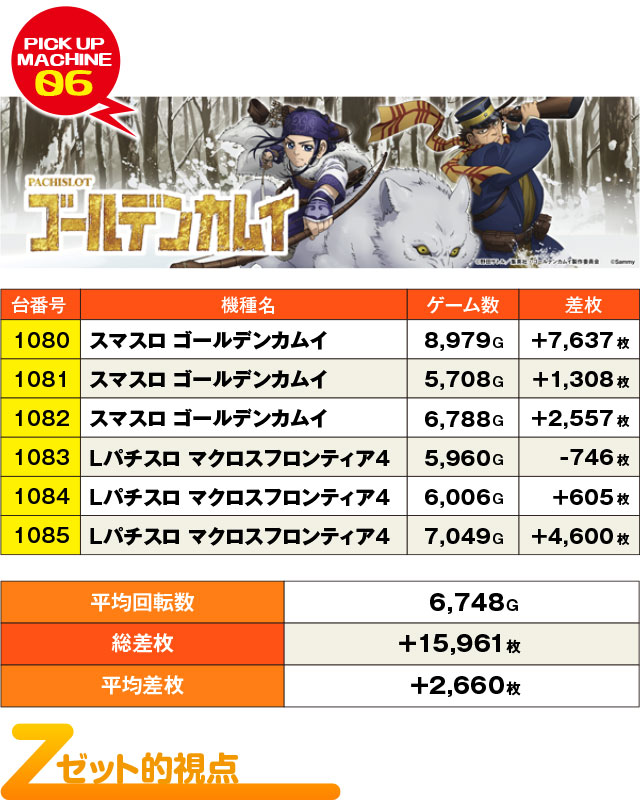 『スマスロ ゴールデンカムイ』と『Lパチスロ マクロスフロンティア4』が並ぶこちらの6台も、非常に怪しい雰囲気を醸し出していた。結果から推察するに、優秀台の6台並びだった…!?