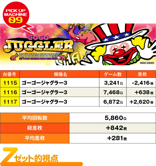毎回、様々な『ジャグ』に優秀台並びが発生するだけに、この3台も優秀台並びだった可能性は十分。1115番台のヘコみっぷりが気になるが総ゲーム数の少なさによるものだろう。