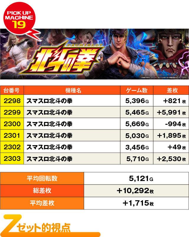 こちらは6台並びと思しきゾーン。6台中5台がプラス差枚となっており、6台の平均も+1,715枚とまずまずの数値。前日も『スマスロ北斗の拳』に6台並びがあっただけに、優秀台の6台並びが濃厚だ。