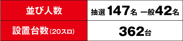 前日は19周年。つまりこの日は周年の翌日であり、普通に考えれば回収に入るべき日。しかしこの日も優秀台並び・全台系・ニブイチ・単品の仕掛けが数多く見られ、前日に負けるとも劣らずの結果を残してくれた。19周年パワーはどこまで続く…?