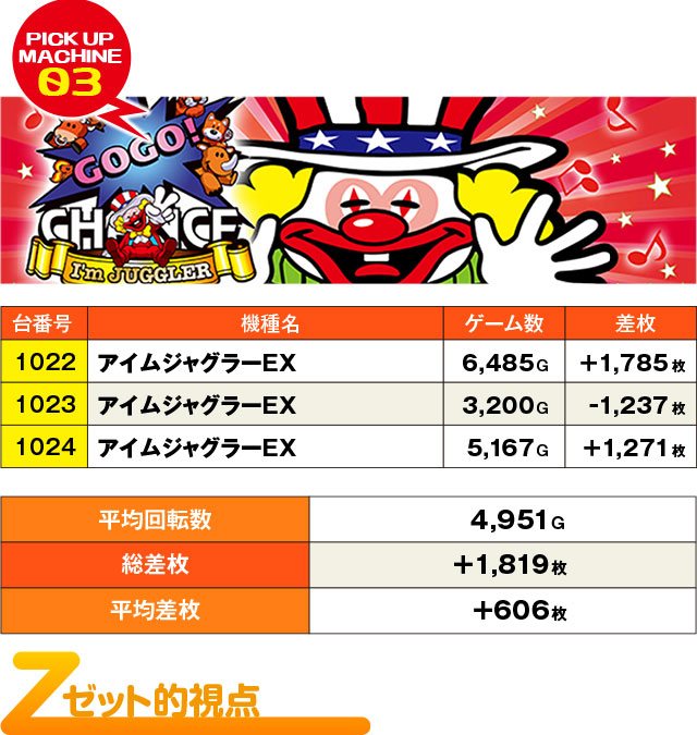 他の『ジャグ』に負けじと、『ゴーゴージャグラー3』にも3台並んでプラっていたゾーンあり。しかしプラス値が控えめだったため、優秀台並びかどうかの判断は難しい…。