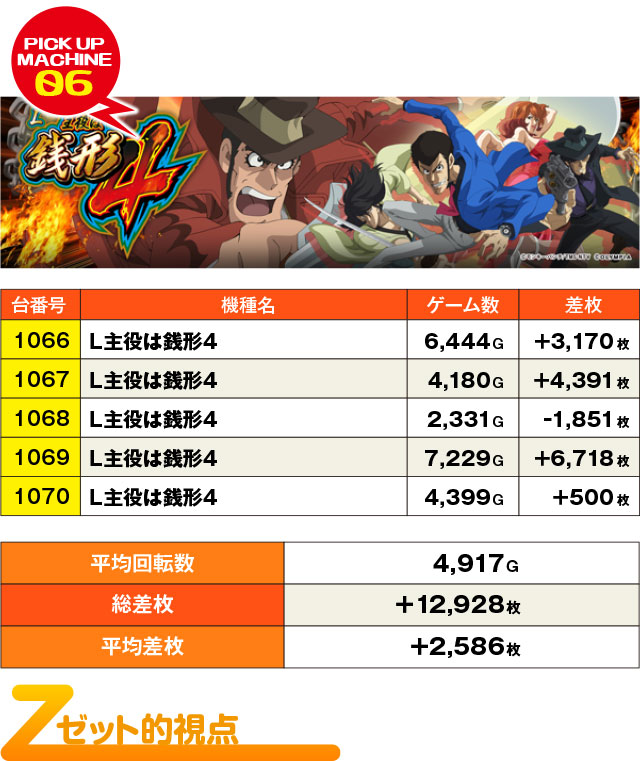 絶好調を地でいく活躍を見せたのは『L主役は銭形4』。6台設置のうち半数の3台から+3,000枚オーバー記録が飛び出したのである。これは5台並びで間違いない…!?