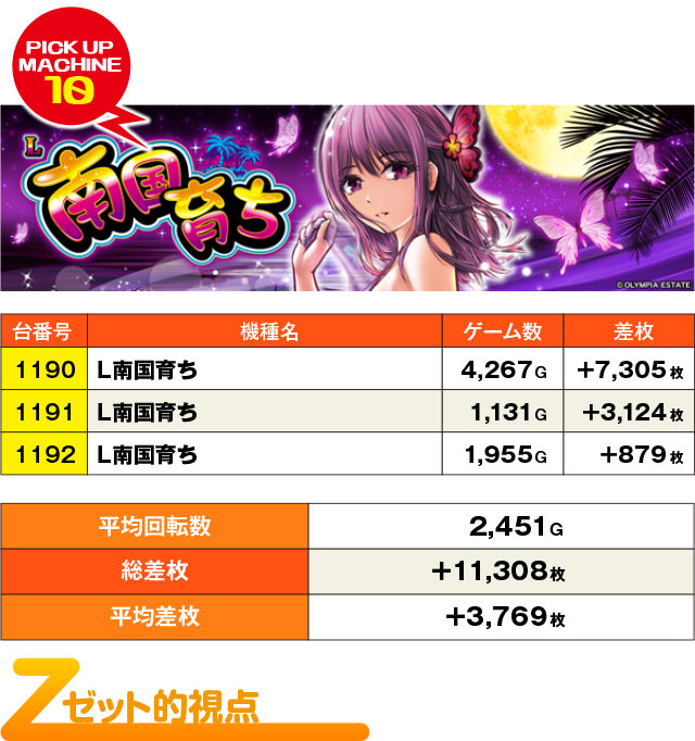 1190番台の7,000枚超えを皮切りに、お隣は3,000枚超え、そのお隣もプラス!これは優秀台が3台並んでいたと考えて問題なさそうだ。