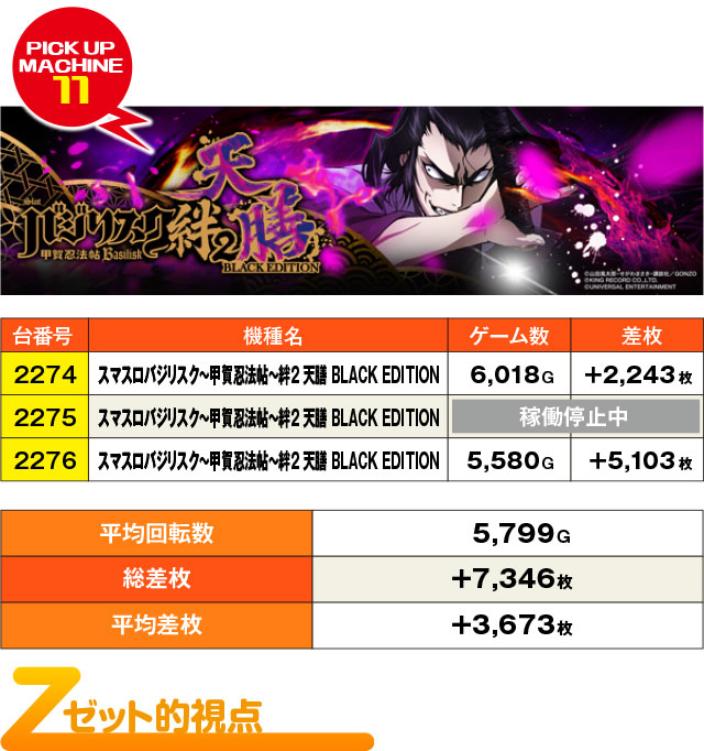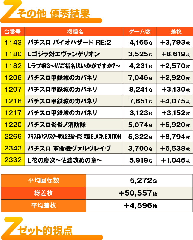 優秀台と思しき台が多く投入されていたのは『パチスロ甲鉄城のカバネリ』。複数台投入ではなかったが、抜群の結果を残したのは『Lゴジラ対エヴァンゲリオン』と『スマスロバジリスク~甲賀忍法帖~絆2 天膳 BLACK EDITION』だった。