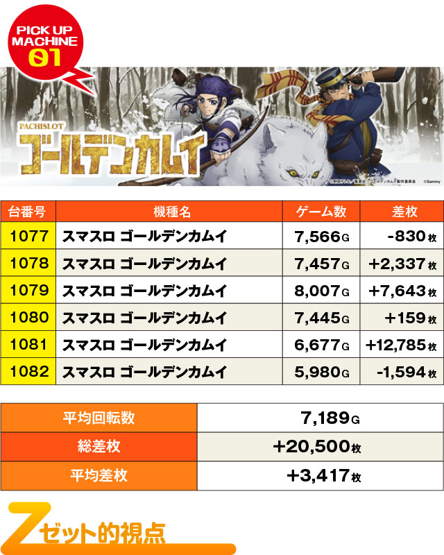 6台設置の『スマスロ ゴールデンカムイ』は、6台ともから優秀台の気配が…。それを物語るように、1079番台が7,600枚オーバー、1081番台は12,000枚オーバーを達成!これってもしかして全台系だった!?