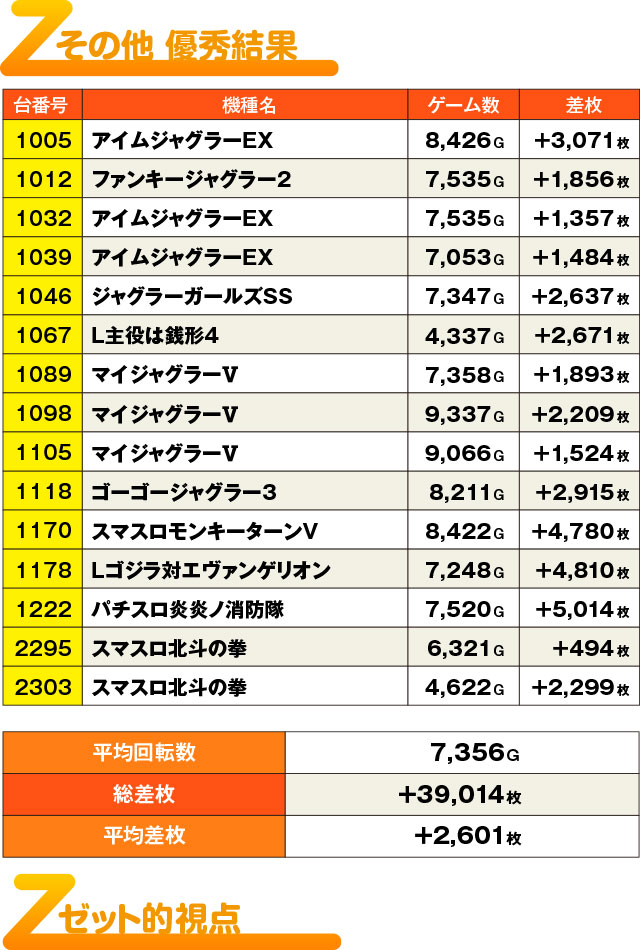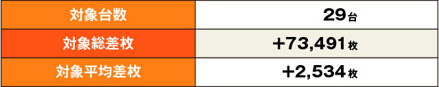 今回の対象台数は計29台。久しぶりに30台以下となったわけだが、平均が+2,000枚超えしているのはいつも通り。また今回は全台系と思しき機種とニブイチと思しき機種が出現したことで、パチスロコーナーのボルテージはうなぎ上りだったのではないだろうか。