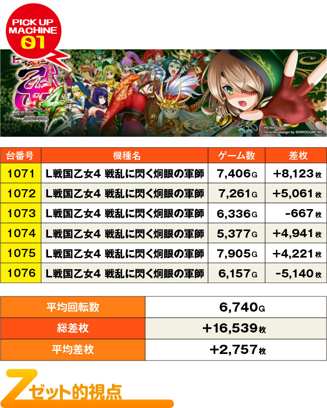 6台設置の『L戦国乙女4 戦乱に閃く炯眼の軍師』の勝率は66.6%(4/6台)。プラスの4台は全て+4,000枚超えというとんでもない差枚を実現した!