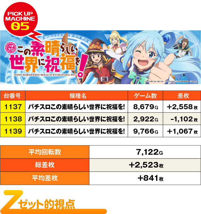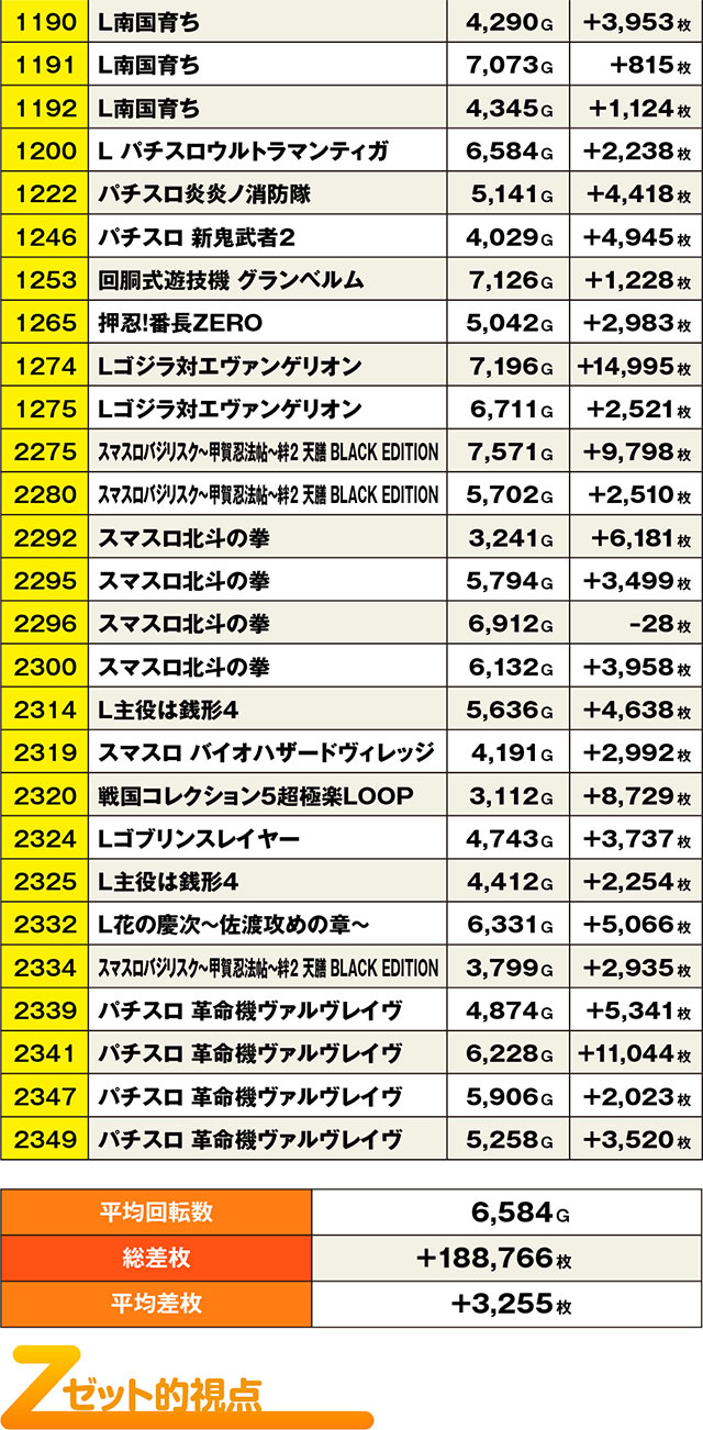 こちらも同じく両脇がプラス。それも+5,500枚を超える特大プラス!REAL取材Zの日にこんな結果を目撃できたのであれば、それは優秀台の3台並び!