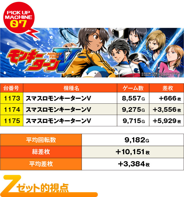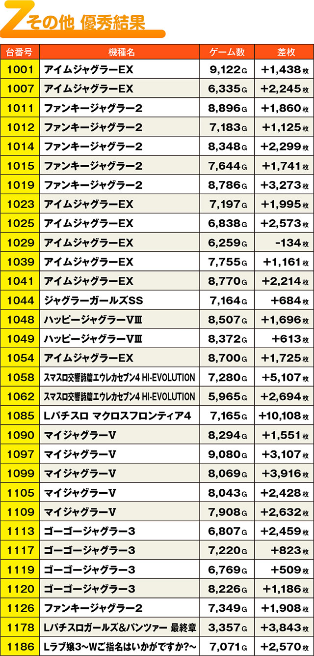 3,500枚超えした台と6,000枚弱の台が隣り合っていた『スマスロモンキーターンV』。この結果を見てよもや偶然だと言う方はいないだろう。無論、優秀台の3台並びに決まっている。